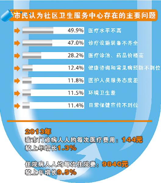 为缓解看病一蜂窝向公立大医院挤,近年来,我市各大乡镇建立并完善社区服务卫生院。但仍有47%的受访者表示,社区卫生服务中心的医疗水平不高;28.2%的受访者认为,社区卫生医疗诊治和药品价格高。