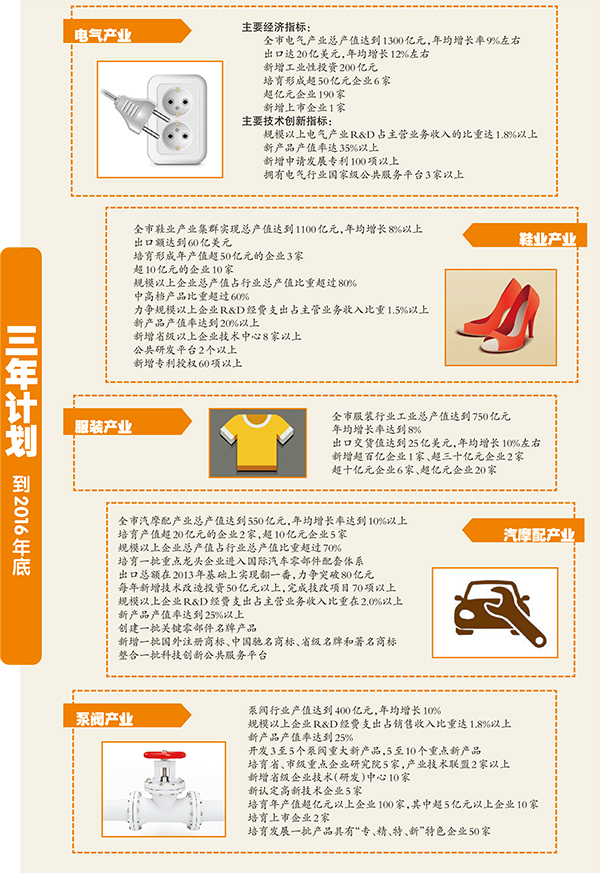 为加快推动产业转型升级,今年年初,市委市政府提出实施“五一○产业培育提升工程”,努力做大做强电气、鞋业、服装、汽摩配、泵阀“五大支柱产业”,培育发展网络经济、旅游休闲、激光与光电、轨道交通等“十大新兴产业”。