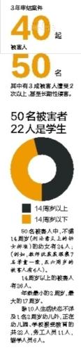 50名未成年被害人中,遭受强奸的有36名,8人是因为醉酒遭到性侵,5人是被诱骗强奸,罪犯诱骗的理由包括游玩、金钱等。