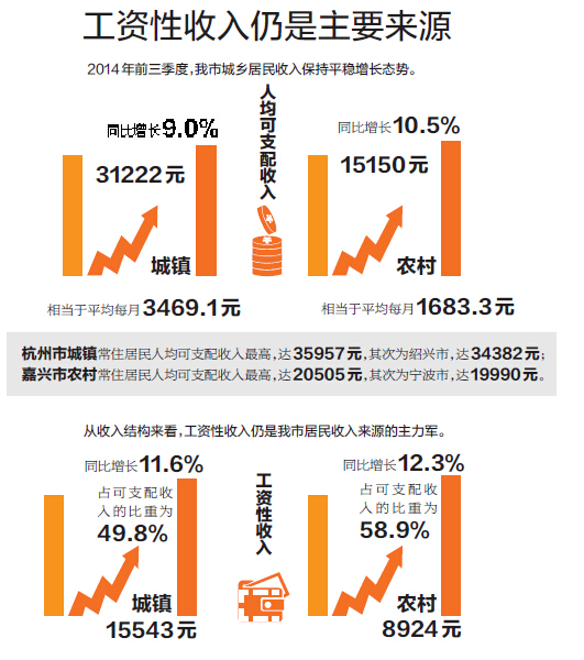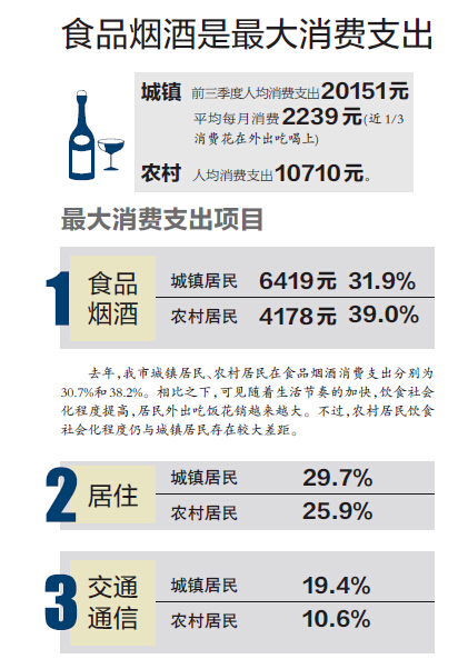 2014年快进入尾声了,温州小伙伴们今年的收入如何?消费如何?据国家统计局温州调查队对全市近3000户城乡居民家庭的抽样调查数据显示:前三季度我市城镇常住居民人均可支配收入31222元,人均生活消费支出20151元;农村常住居民人均可支配收入为15150元,人均生活消费支出10710元。数据显示,城乡居民食品烟酒支出快速增长,成最大支出项目,占比近1/3。