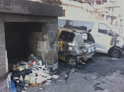 图为昨天凌晨起火的垃圾坞与被烧毁的车辆