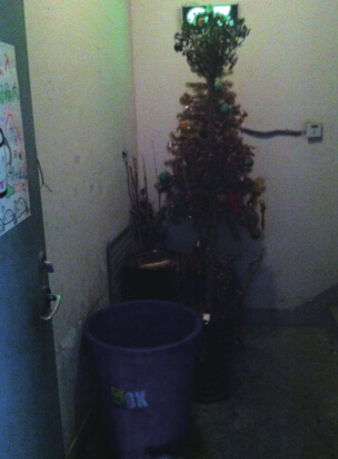 现场:在繁华公寓的高层住宅19楼,检查组看到楼梯口被杂物、垃圾占据了近半空间,杂物包括废弃的圣诞树、花盆、垃圾桶等。记者了解到,目前我市一些住宅小区的楼道堆放杂物的情况比较普遍,不少住户甚至将楼道当做“储物间”,把平时不太常用的架子、桌子等放在楼道间。