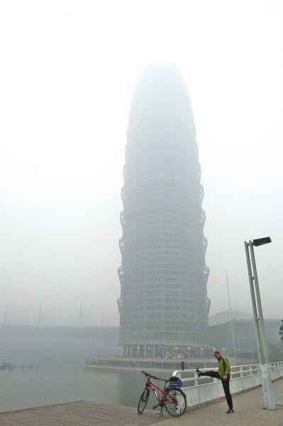 近日郑州市雾霾加重,“大玉米”近距离看也很模糊。