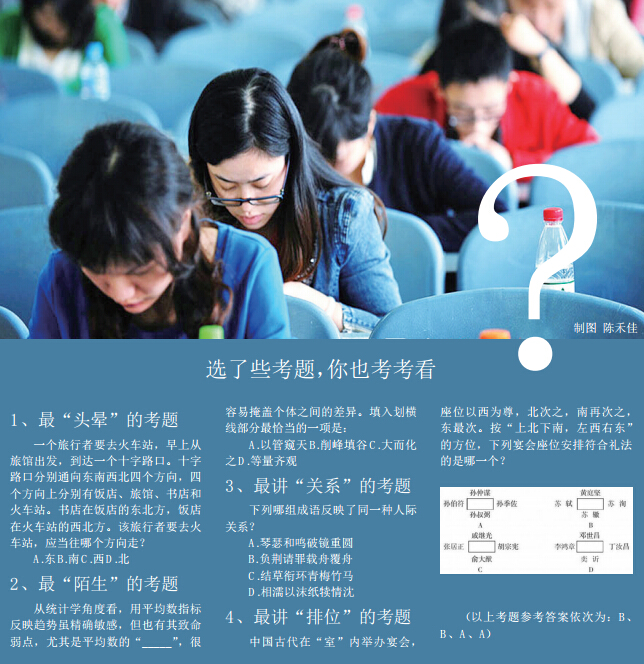 2015年度中央机关及其直属机构公务员录用考试公共科目笔试前天开考。不少考生大呼题目太多,时间太少。还有考生说,试题并不全是高大上,有不少很亲切,甚至是带“时尚元素”的题目。考题范围很广,让人“很涨姿势”。