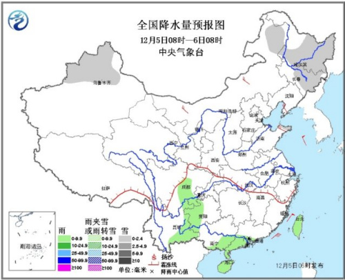 12月5日08时至6日08时,新疆北部、内蒙古东北部、黑龙江大部、吉林中东部、山东半岛东部有小到中雪;华南南部、云南东部、贵州西部、四川盆地南部和西部等地有小雨。内蒙古、新疆北部、华北北部、东北地区、山东半岛等地有4~6级风;黄海中部和南部、东海东北部有7~8级、阵风9~10级的西北风,台湾海峡、南海东北部和中东部有7~8级、阵风9级的东北风。
