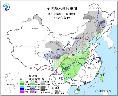 12月9日08时至10日08时,新疆阿勒泰和塔城地区、西北地区中东部、华北、内蒙古中东部、东北地区大部、黄淮北部等地有小到中雪或雨夹雪,局地大雪;西南地区东部、黄淮西南部、江汉、湖南西北部、广西西北部、海南东部和北部、台湾等地有小雨或阵雨,局地有中雨或大雨;新疆东部、内蒙古中西部、甘肃大部、宁夏、华北西部和北部等地有4~6级风。台湾海峡、南海大部有7~8级、阵风9~10级的大风。