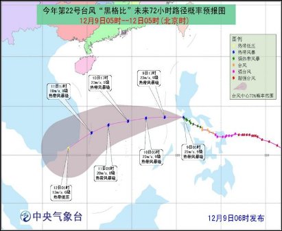 预计,“黑格比”将以每小时15-20公里的速度向偏西方向移动,将于今天白天进入南海东部,以后转向西偏南方向移动,逐渐趋向越南东南部沿海,强度缓慢减弱。中央气象台12月9日06时发布台风蓝色预警。