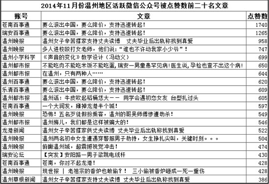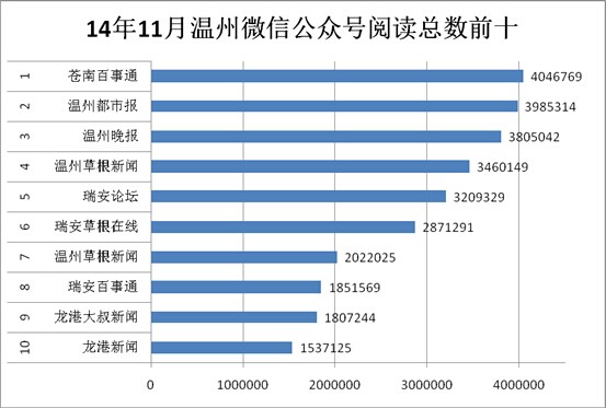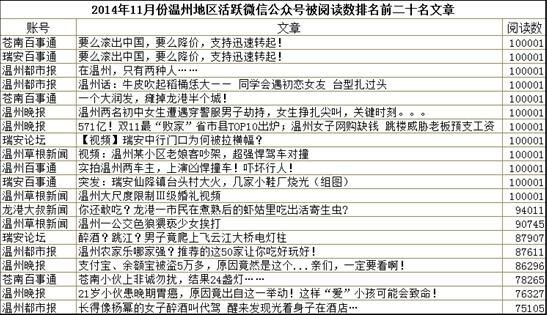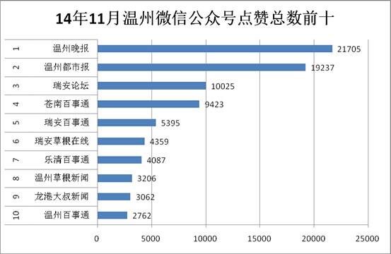 (记者温婉)近日,温州信息化研究中心出炉了一份《2014年11月温州地区活跃微信公众号影响力报告》,通过分析文章数、阅读数、点赞数、文章正文等,对温州微信公众号进行总影响力排名。其中,“温州晚报”微信公众号在11月份拔得头筹。