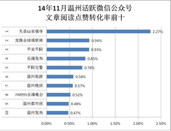同平均点赞数的情况类似,为了避免那些因为阅读数过少而导致阅读点赞率虚高的情况,也必须有一个活跃度要求。本报告这里要求阅读量至少超出所有被监测微信公众号阅读量平均值以上,在11月份,这个平均值为52046以上。可以看出,政务类微信占据了前十榜单的绝对优势。分别是“平安平阳”、“乐清发布”、“平阳交警”、“温州旅游”、“温州发布”。值得注意的一点是,五个政务类微信,安全信息发布占了三席。其次,是第一名“天圣山安福寺”也非常引入注目,转化率远远高出第二名,充分体现了宗教旅游文化的独特魅力。“温州发布”排名10位,平均被点赞数0.47%。