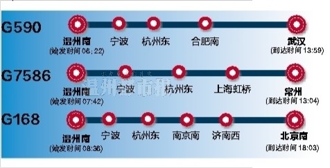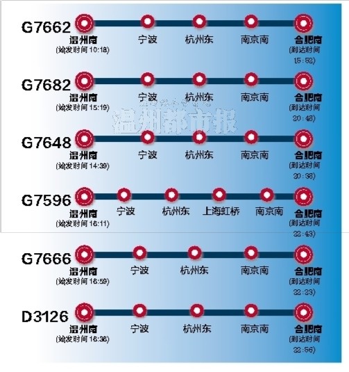 昨天,全国铁路新运行图正式实施。温州南至武汉的高铁首次开通。调整后,温州有6对动车的终点到达站延伸到合肥南站,温州共有15趟动车延长到站区段,并新增了5对始发列车。