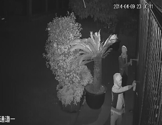 监控果然逮到了神秘喷漆人。监控显示,4月9日晚上11点,四下无人,两名男子出现在监控里,蒙着面。他们各自拿出罐装油漆,一阵乱喷。