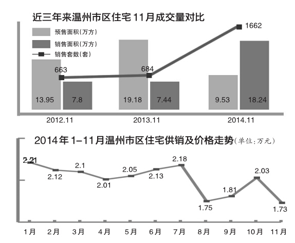 日前,国家统计局温州调查队根据温州市房产管理局商品房的网签数据,在分析信息中指出,市区新房11月份成交量共计销售1663套,较上月增加183.3%。记者昨天从朗兆温州房产公司获悉,该公司市场研究中心经过对11月份的楼市监控和分析,也同样证实了温州11月份市区新房成交量创新高,而且是近三年来同期成交量的首位,成交均价为1.73万元/平方米。