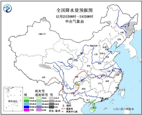 25日08时至26日08时,新疆塔城、伊犁河谷西北部、青海东南部、陕西中部和南部、山西西南部、湖北西北部等地的部分地区有小雪或雨夹雪;西南地区东部、江汉南部、华南大部、台湾等地的部分地区有小雨或阵雨,局地中雨。新疆阿拉山口、内蒙古中部等地有4~6级风。台湾海峡、南海东北部有7~8级、阵风9级的东北风。