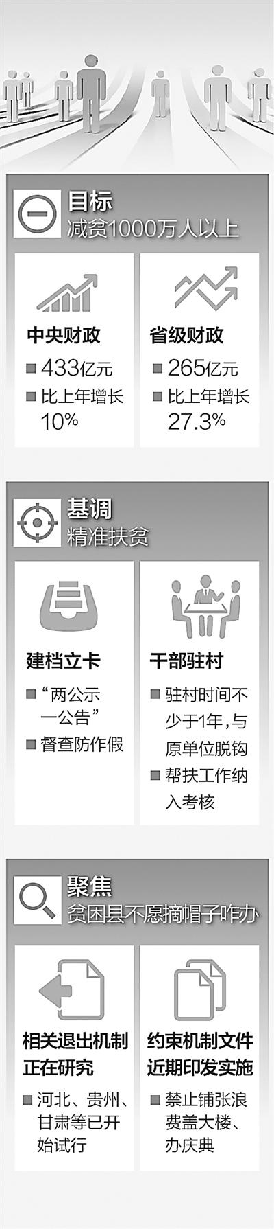 为完成减贫目标,各级财政普遍加大了扶贫投入。中央财政安排专项扶贫资金433亿元,比上年增长10%;省级财政预算安排扶贫资金265亿元,比上年增长27.3%。