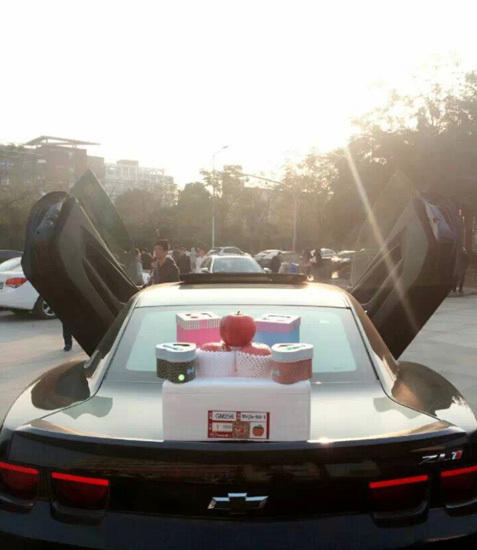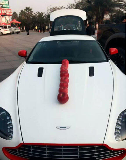 400多万的阿斯顿马丁,200多万的玛莎拉蒂,保时捷911,100多万的悍马……在宁波大学北区学生二村的门口,五六辆豪车排成一列,比较特别的是,每辆车的前盖上都放着一个个包装精美的红苹果。
