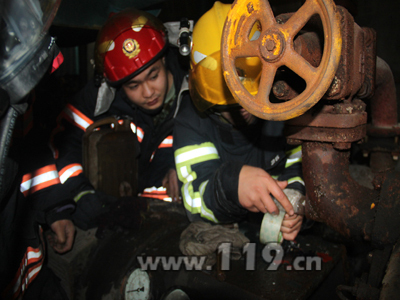10点48分时,永宁消防中队救援人员到达现场,闻到周边的空气中弥漫着刺鼻的氨气味,立即成立现场侦察组。经侦察,发现该厂是一废弃两年的制冰厂,氨气管道阀门都已生锈,氨气从生锈的阀门出泄漏,还有一个长约5米直径约1.5米的氨气储罐还有一半的液态氨气,所幸的是周围已无人员工作居住。指挥员马上命令两名攻坚组成员做好个人防护对泄露的管道阀进行堵漏,并联系工厂技术人员关闭输氨阀门。至11时10分,氨气储罐阀门已被永宁中队消防官兵成功堵住,在场的安监和环境部门对现场环境进行了检测,事故成功处置完毕。厂区现存氨气储罐已联系相关部门立即输转。