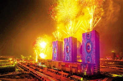 昨晚,温州站南服饰批发广场举行展会招商正式启动仪式,并进行亮化实景展示和烟火晚会。杨冰杰摄