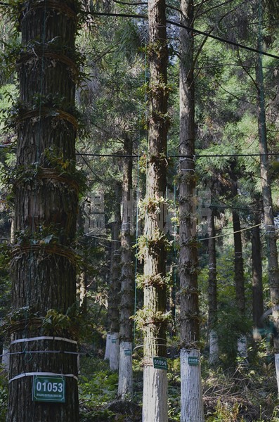 周纪迁的铁皮石斛种植基地,在永嘉四海山海拔1000米以上的一片面积达3000亩的林场里,共投资了3.5个亿。如今,其中1000亩地已经种上了铁皮石斛。与其他的大棚内种植的铁皮石斛不同,这儿的铁皮石斛是“种”在树上的——一丛丛铁皮石斛苗都是用稻草绳和青苔绑在树干上种植,铁皮石斛就这样在树干上生根、发芽、成长。