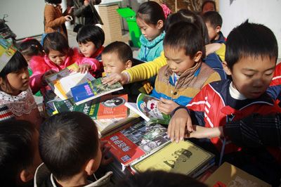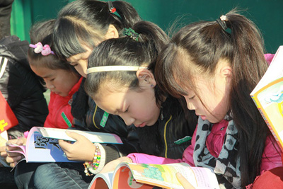 由于都是民工子弟,他们的父母为了生计没时间带他们去图书馆看书,但他们都很喜欢读书。一到校园,工作人员刚把书摆在桌上,小读者们便涌过来,有的直接拿着书站着读;有的捧着四五本书,找好位置,坐着慢慢读,一脸的心满意足。课余时间,来自温职院大学生志愿者和民工子弟学校的学生进行了丰富多彩的互动活动,小小的操场上满是欢声笑语。