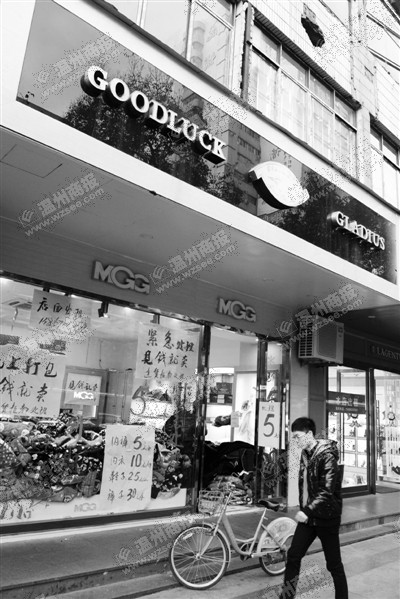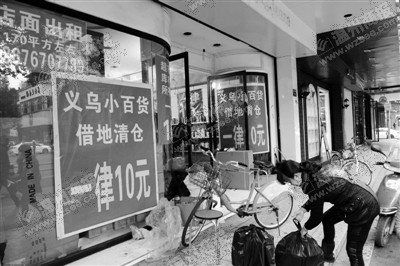 “50元一件棉服,见钱就卖”,“60元一双好鞋,工厂清仓”,“义乌小百货,一律10元”……伴随着或轻或重的摇滚舞曲,一段不到百米的街上,就挤进了10来家打着减价清仓甩卖口号的特卖店,在招徕着路过的市民。