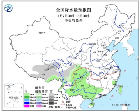 7日08时至8日08时,西藏中东部、青海南部、川西高原、云南西北部等地有小到中雪或雨夹雪,局地大雪;西南地区大部、华南中西部、台湾等地有小到中雨。内蒙古西部等地有4~6级风。