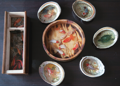 而黄嗣家目前还有7件成品,其中有5件是用大鲍鱼壳作容器的,他说,他家里是开饭店的,大鲍鱼壳比较多,对作画而言,其大小正合适。