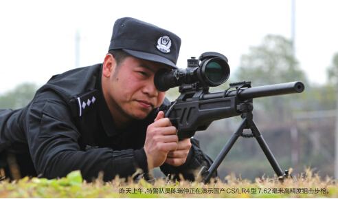 昨日上午9时,该支队一大队一中队在温州军分区教导队训练场开展冬季集训。其中,一支黑色狙击步枪引人注目,它便是国产CS/LR4型7.62毫米高精度狙击步枪。该支队一大队大队长何军说,当天是这支狙击步枪的处女秀,也是支队拥有的第2支该型号高精狙击枪。“2012年时,我们从北京引进了第一支;上月下旬,我们又引进了第二支。”