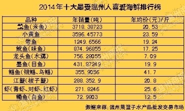 红烧带鱼、清蒸小黄鱼、敲鱼汤……无论是宴请宾客还是家人小酌,每个温州人嘴里,都有一味绕不开的海鲜。在刚刚过去的2014年,温州人最爱吃的海产品有哪些,为什么会对这些海鲜情有独钟,它们的价格和前一年相比又有什么变化呢?昨天,温州菜篮子水产品批发交易市场的一份数据为我们揭晓了答案。鱼(米鱼)、小黄鱼、带鱼是过去一年温州人最爱吃的海鲜前三甲。