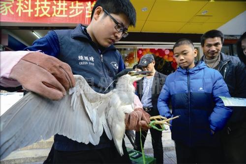 温州市民吴先生在江边发现一只大鸟被渔网困住,身上多处被勒伤。吴先生把它解救出来后,于昨天上午交给绿眼睛环境组织的志愿者。