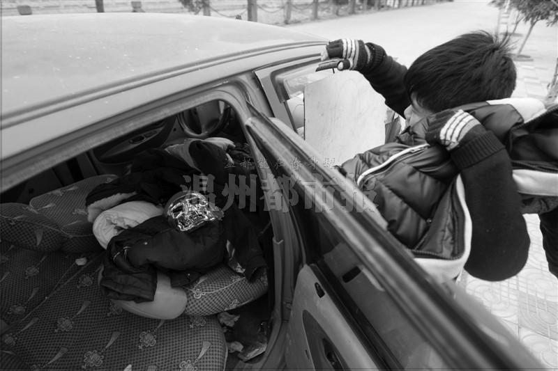 因为那辆车的车窗已经破了,小乐找来木板放在上面挡风。车里面放着两件羽绒服和一条棉被。小乐说,棉被是邻居怕他在这里睡觉太冷而送来的。