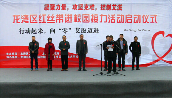 区教育局副局长徐志毅主持启动仪式。温州市疾病预防控制中心艾性所所长王大勇介绍了当前艾滋病防控形势,并希望通过这些活动,向广大青少年学生传播防艾知识,引导学生正确认识艾滋病、科学预防艾滋病、积极宣传艾滋病防治知识。区卫生局副局长陈建勇在会上致辞,通报了我区艾滋病疫情情况以及所面临的挑战,号召同学们加入到防艾志愿者队伍中,消除冷漠,凝聚力量,攻坚克难,一致防艾,做防艾的倡导者、实践者、传播者,为实现“零”艾滋而奋斗。