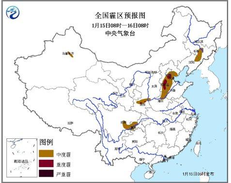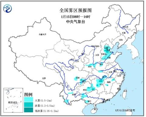 今天,华北黄淮等地的雾霾持续加重,预计,15日,东北地区中部、华北中南部、陕西关中、四川盆地西部及南部等地有中度霾,其中,北京南部、天津西部、河北中南部沿山部分地区、陕西关中局地有重度霾;15日早晨到上午,华北东部、陕西关中地区、河南东北部和西部、江南中西部、四川盆地西部和南部、贵州东南部、云南南部、广西西部等地的部分地区有大雾;其中,北京南部、天津南部、陕西关中地区、湖南东北北部和西南部、贵州东南部、四川盆地南部等地的部分地区有能见度不足500米的浓雾,局地有能见度不足200的强浓雾。为此,中央气象台1月15日06时继续发布大雾黄色预警、霾黄色预警。