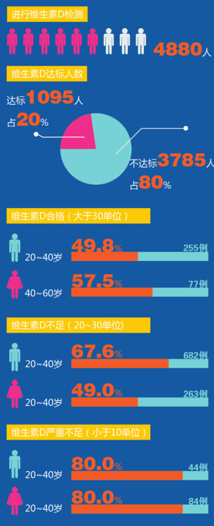 根据市中西医结合医院检验科的统计数据显示,去年该院共有4880人进行了维生素D的检测。结果发现,达标(指标大于30个单位)的仅有1095人,只占了2成,还有8成人都不达标。