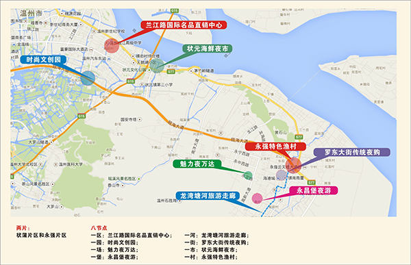 据了解,结合我区的夜市经济发展实际,《方案》按照“两片八节点”(两片:即状蒲片区和永强片区,八节点:即一区:兰江路国际名品直销中心;一园:时尚文创园;一场:魅力夜万达;一堡:永昌堡夜游;一河:龙湾塘河旅游走廊;一街:罗东大街传统夜购;一市:状元海鲜夜市;一村:永强特色渔村)月光经济发展空间布局(详见参考图),提出了“龙湾区2015—2017年月光经济发展计划”及2015—2020年我区月光经济发展目标。