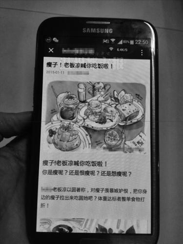 这家位于市区学院西路的茶餐厅日前在微信上发起了一项针对瘦子的优惠活动。活动宣传页面介绍:“老板凉(娘)以圆著称,对瘦子羡慕嫉妒恨,把你身边的瘦子拉出来吃圆她吧?体重达标者整单食物打折!”下文还针对不同性别、不同体重的客户给出了3.9至6.9折的优惠。