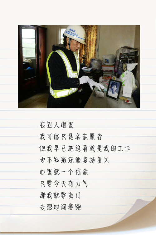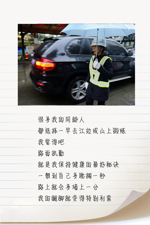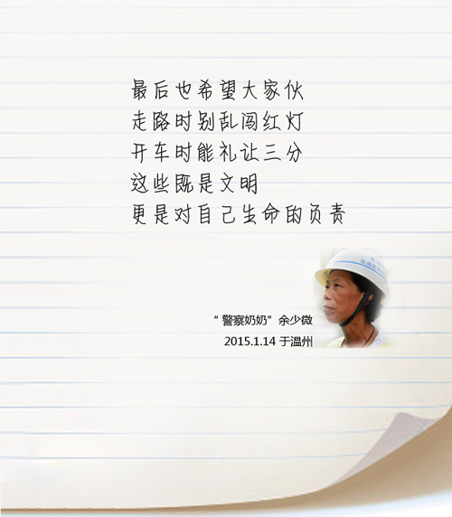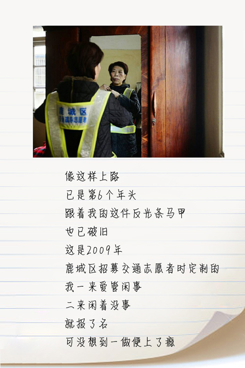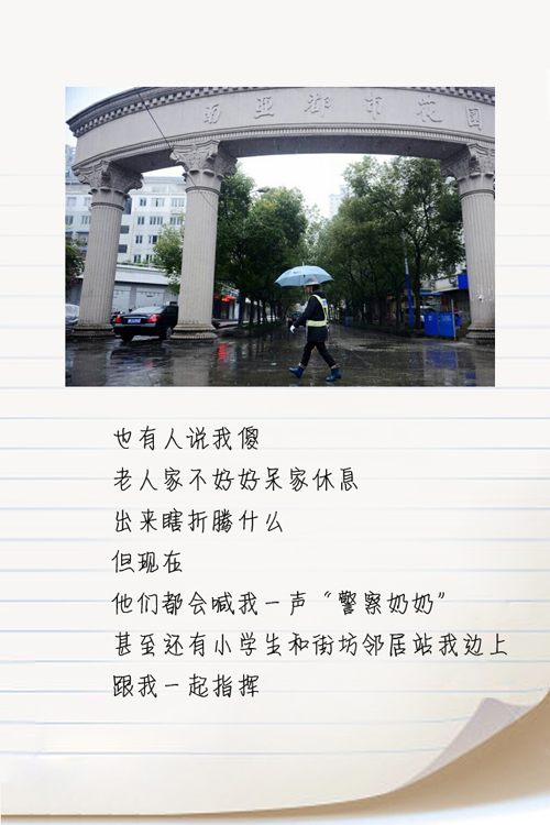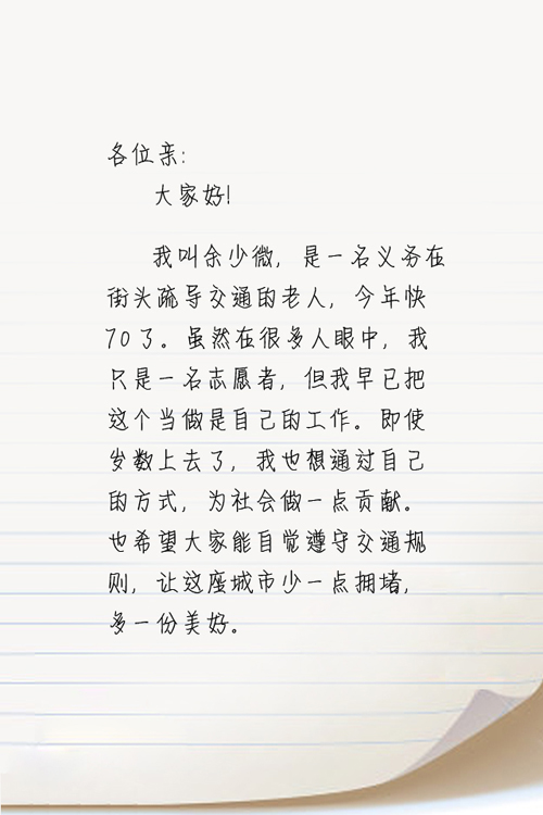 小编的话:自城市摄影家孙新尖给小编回信后,信中的主人公之一——“最美警察奶奶”余少微也按捺不住来了一篇她的情书。这篇情书,让我们看到了一位七旬老人对参与社会治理的执着,以及为他人服务的无私情怀。