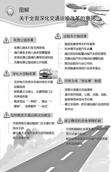 高速公路收费怎样更合理?出租车价格如何调整?大部制改革怎么推进?交通运输部近日出台的《关于全面深化交通运输改革的意见》(简称《意见》)对这些百姓关注的热点问题进行了回应。
