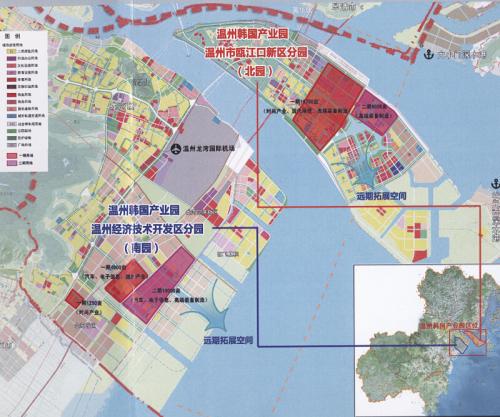 韩国产业园分为两个分园,一个是北园,落在瓯江口新区,另一个是南园,入驻温州经济技术开发区,总规划面积约30平方公里。