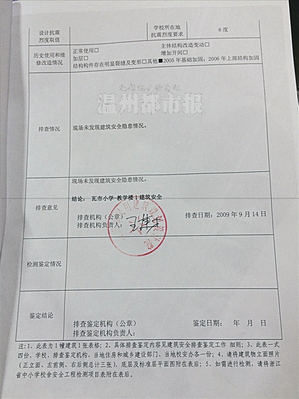 这份报告的“排查意见”一栏写着:“现场未发现建筑安全隐患情况。结论:瓦市小学——教学楼1建筑安全”。排查时间落款为2009年9月14日。