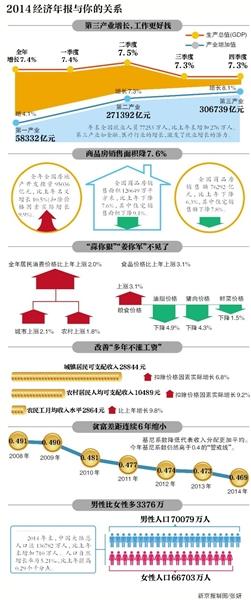 此外,人口就业总体稳定——年末全国就业人员77253万人,比上年末增加276万人。中国社会科学院数量经济与技术经济研究所副所长李雪松表示,国家经济结构调整使第三产业2014年发展迅速,尤其是在一些垄断产业上取得突破,例如金融、医疗的竞争机制激发了就业增长的潜力,加上GDP总量规模扩大,首次突破10万亿美元,也释放了更多就业机会,拉动作用凸显。