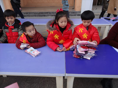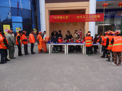 在活动的现场,小朋友们一张张稚嫩的笑脸传递着真情,一双双稚嫩的小手将活动倡议书送到每一个人的手里,将保暖手套亲自送到环卫工人手里,真诚地感谢环卫工人们为整洁和美丽付出的辛勤劳动。这些保暖手套是小朋友们利用他们平时攒下的零花钱购买的。