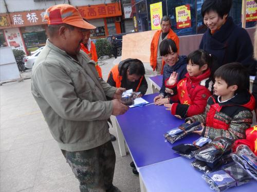 在活动的现场,小朋友们一张张稚嫩的笑脸传递着真情,一双双稚嫩的小手将活动倡议书送到每一个人的手里,将保暖手套亲自送到环卫工人手里,真诚地感谢环卫工人们为城市整洁和美丽付出的辛勤劳动。这些保暖手套是小朋友们利用他们平时攒下的零花钱购买的。