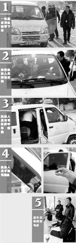 经过多方取证后,运管执法人员决定收网。在温州大学城市学院的南大门,两辆牌照分别为浙CJ1E83和浙CC8U81的“小黑”,一前一后几乎同时到达并下客,当学生全部下车后,守候在附近的执法人员大步上前将两车拦下,这让刚收了钱的黑车司机有些措手不及。其中浙CC8U81的黑车司机慌乱中想发动车子,打算逃离现场,执法人员立即对此加以了阻止,不想遭遇了黑车司机强烈反抗,双方在车上僵持不下,其余执法人员看到后立即上前制止,但是司机还是坚决不下车,并伺机强行拿走车钥匙,其中一名执法人员的手被车钥匙划伤,鲜血直流。最终在多名执法人员的协助下,才将这辆面包车给扣了下来。而这名黑车司机态度非常嚣张、弃车离去。