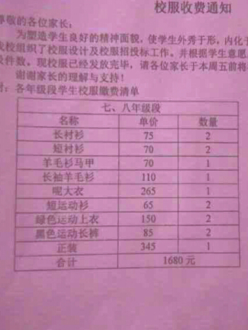 收费1680元,其实是8套校服共14件