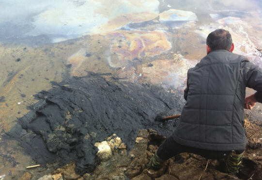 一名老农用锄头轻轻一挖,坑里立即翻滚出墨汁般的淤泥。老农说,这个坑起码有1.5米深,而旁边那个已经被推平的大坑,用锄头一挖,同样溢出黑如墨汁的淤泥。经过雨水冲刷,坑里的污水已经流淌到周边大片农田,上面还漂浮着一层油污。