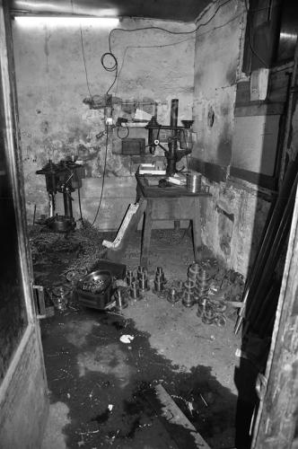 通过相关人士提供的照片,可以看到这个小作坊的一楼是一些钻床等设备,二楼放着两张破旧的床,床上堆满了衣服和被子等,显得非常杂乱。