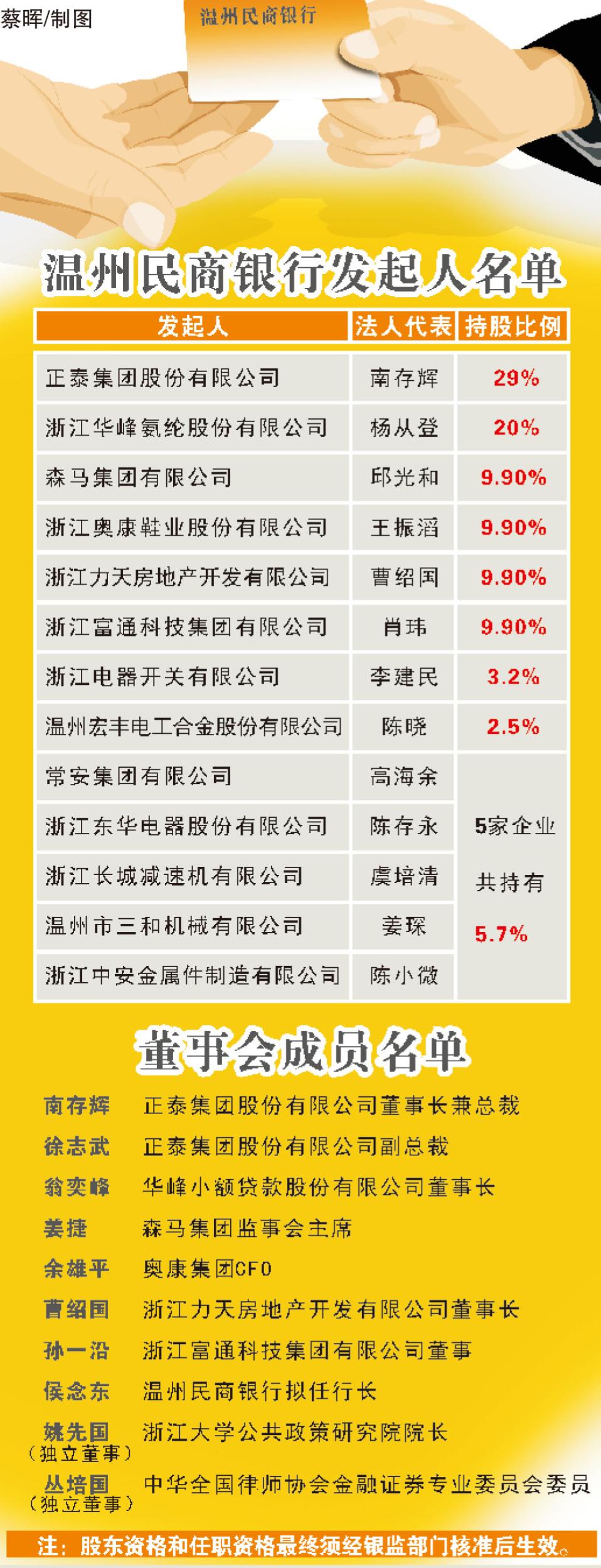 温州民商银行获批筹建后,民营银行股东构成和参股比例一直是外界关注的焦点。昨天最终亮相的温州民商银行股东可谓“兵强马壮”。正泰集团和华峰氨纶为主发起人,持股29%、20%。森马集团、奥康鞋业、浙江力天房地产、浙江富通科技集团等4家公司均以自有资金出资1.98亿元,各占总股本的9.90%;浙江电器开关有限公司出资6400万元,占总股本的3.2%;温州宏丰电工合金股份有限公司出资5000万元,占总股本的2.5%;常安集团有限公司、浙江东华电器股份有限公司、浙江长城减速机有限公司、温州市三和机械有限公司以及浙江中安金属件制造有限公司共同持有5.7%股份。