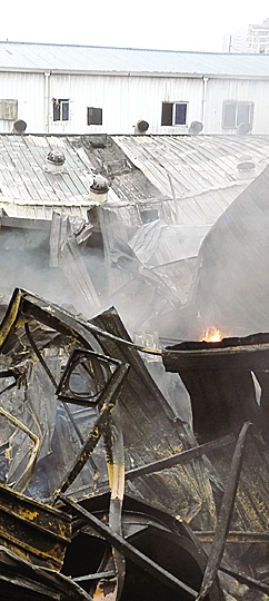 | 昨天上午10时,仍有明火复燃,发出浓烟。 龚培诚 摄 |