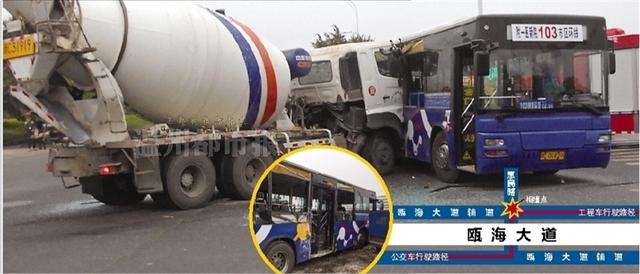 发生车祸的是一辆103路公交车,当天中午11时多,正从温医大附一院新院区开往市区。在瓯海大道辅道左转弯进入惠民路时,与一辆从瓯海大道辅道直行的水泥搅拌车相撞。据现场目击者称,当时水泥搅拌车车头撞到公交车后门位置,两车受损严重。
