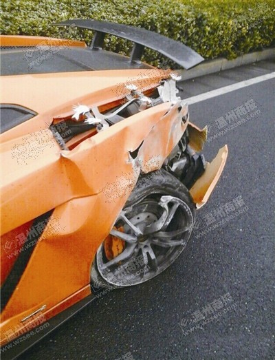 昨天,有杭州媒体发微博称,昨天凌晨4时40分许,一辆兰博基尼在杭州钱江四桥撞了高架边护栏;之后又有一辆面包车与私家车发生碰撞。根据微博图片显示,兰博基尼为温州牌照(浙CYP×××),该车的车头已严重损坏,车尾左后部位也有撞损,后置的发动机裸露。